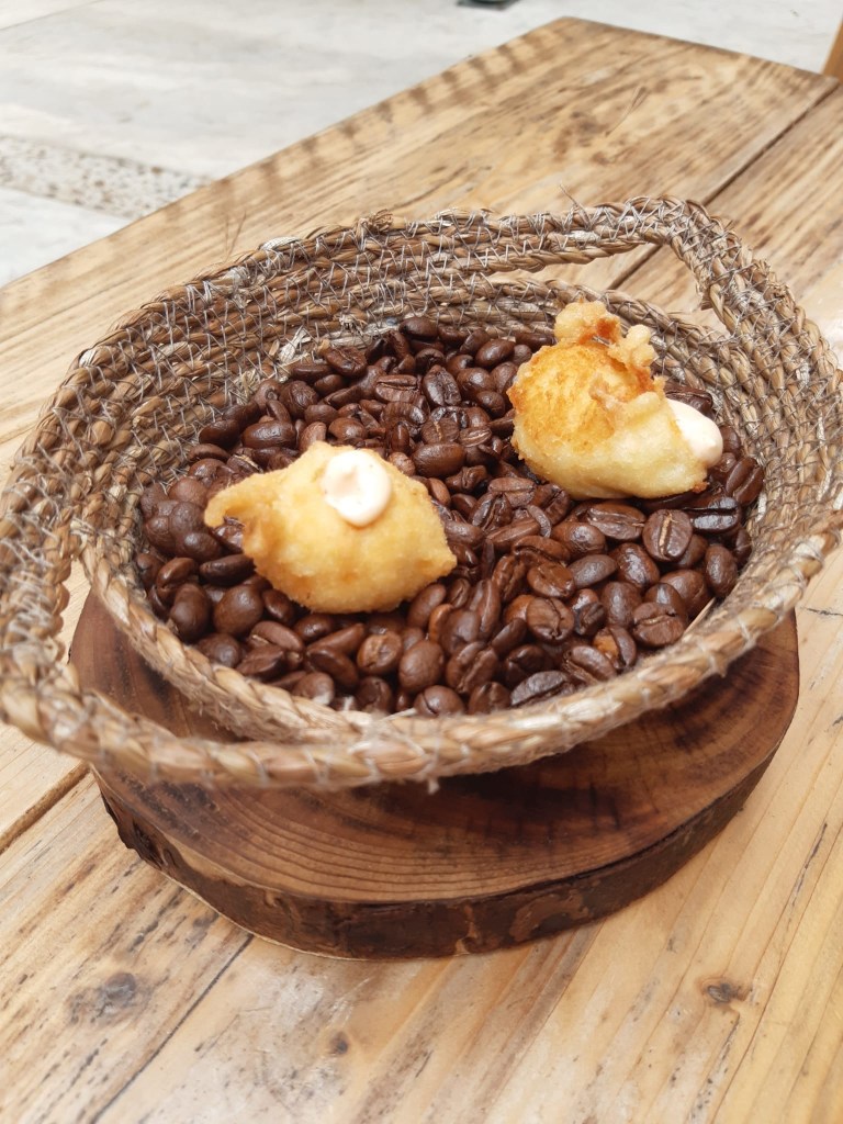 Buñuelos de patata coronado por un toque de all-i-oli sobre una cama de granos de café servido en una pequeña cesta.