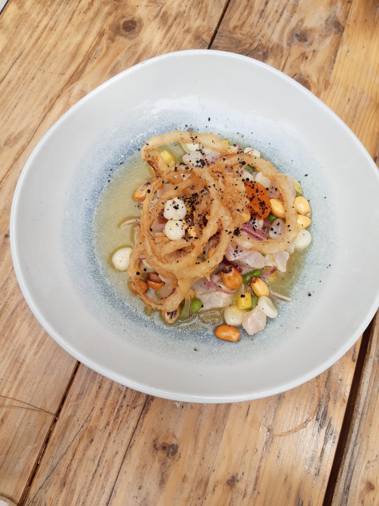 Ceviche Can Pasqual. El plato que más me gustó en todos los sentidos, visualmente precioso, olía a cítricos y su sabor en boca producía una explosión de sabores frescos por el pescado, crujiente por los kikos, y todo regado por una salsa cítrica suave que le daba el toque perfecto.
