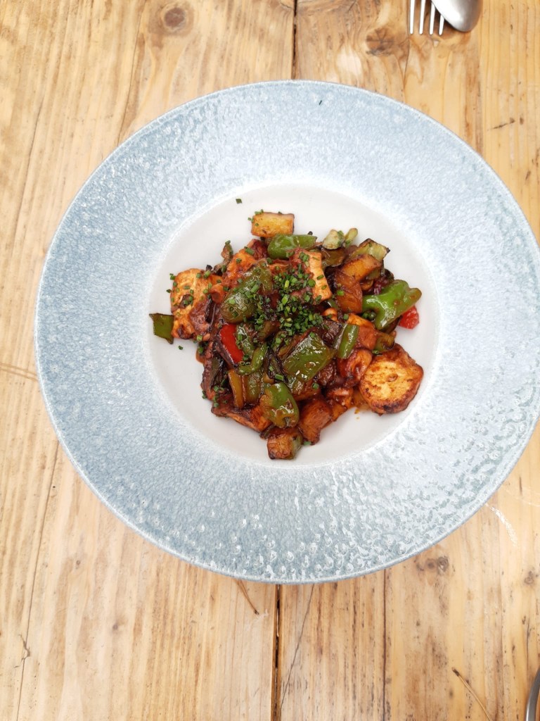 Frito de pulpo. El pulpo bien cocinado me encanta, y elegimos este plato que indicaba en la carta que era tradicional de la isla. En las islas baleares preparan el pulpo guisado con verduras como el pimiento, zanahoria y por supuesto con la patata que combina tan bien siempre el octópodo.