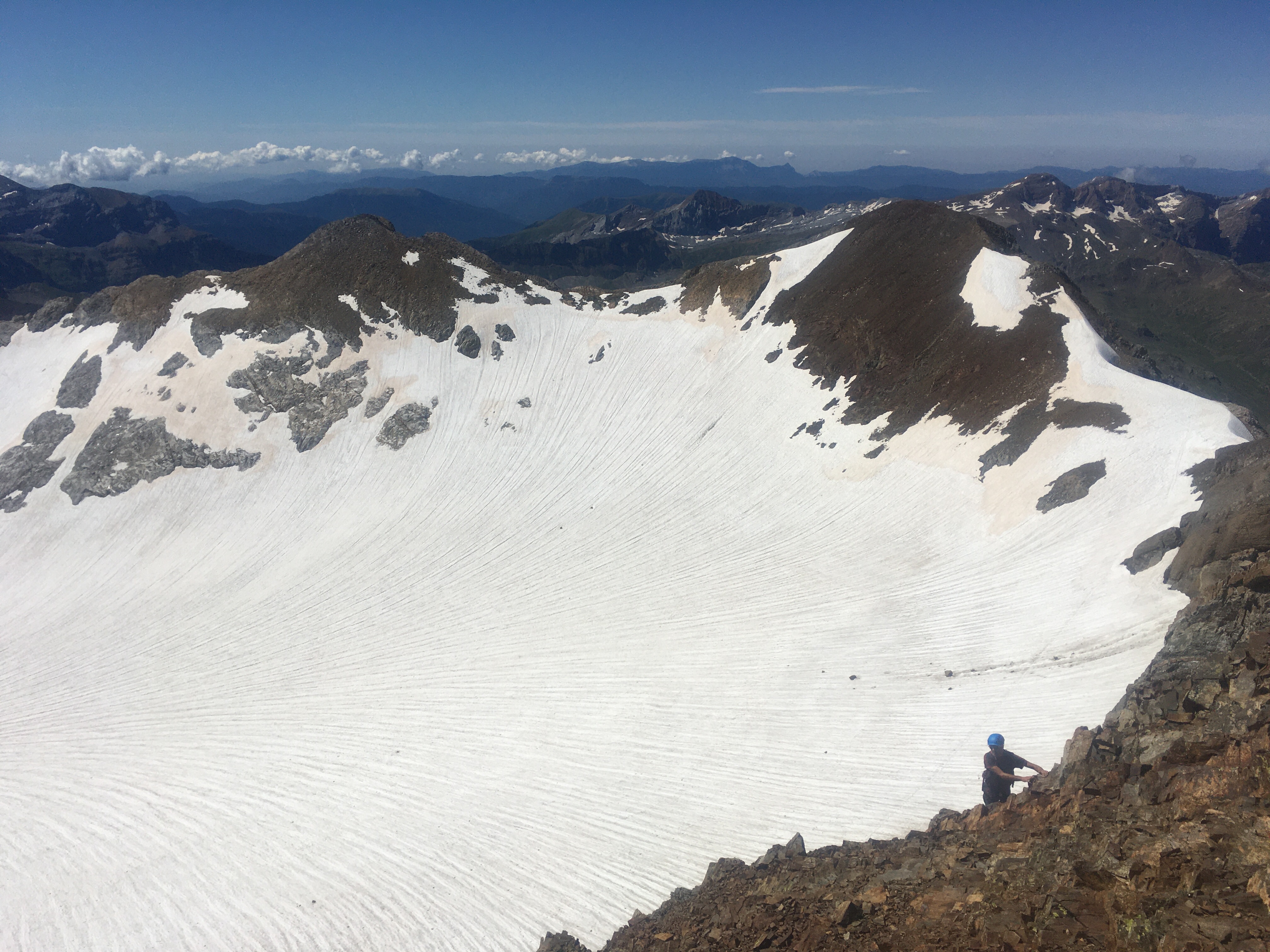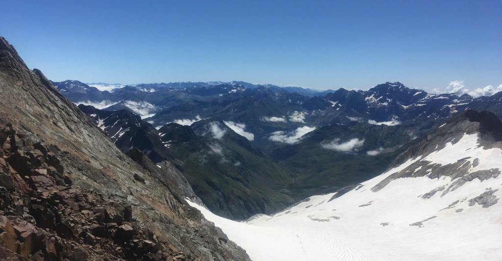 Cuando llegamos al Vignemale, nos quitamos los crampones y empezamos la escalada. Muy importante llevar el casco porque en algún momento de la subida hay piedras que se desprenden. Yo la verdad que iba segura con mi hermana y mi cuñado que son muy montañeros, tenía mucho respeto y cuando alcancé la cima y ví la inmensidad de las montañas entendí porque les gusta tanto, es una satisfacción lograrlo y poder ver semejante paisaje. Pero tengo que decir que yo que soy muy de sacar el móvil y hacer mil fotos, la verdad que allá arriba no me atrevía ni a moverme, al principio me costó superar que estábamos a 3298 metros!