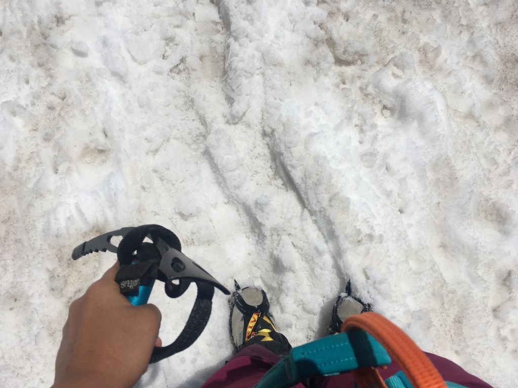 Antes de empezar el glaciar nos preparamos, nos pusimos los crampones y cambiamos los palos de andar por el piolet. Como yo no suelo utilizarlos cada año, y además es sitio que te ocupa si no los necesitas habitualmente, seguí las recomendaciones y alquilé los crampones y el piolet en una tienda de Valencia (Aventura Giménez).