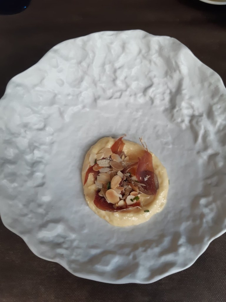 Empezamos con un aperitivo de la casa, una ligera crema de calabaza con queso y semillas de sésamo, para preparar la degustación gastronómica que empieza ya…