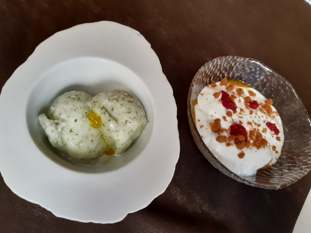 Terminamos con una elección de postres ligeros como el sorbete de albahaca, muy digestivo después de tal banquete, y la cheesecake de coco, muy cremosa con sorpresa de mango en el fondo… mmm!
