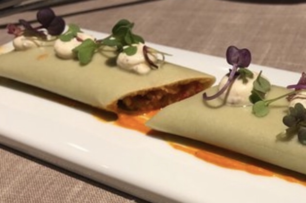 Canelón de verduras escalibadas con crema de pimientos asados y mayonesa tártara.Hummus de farinetes con crujiente de wanton y pimienta de espelette