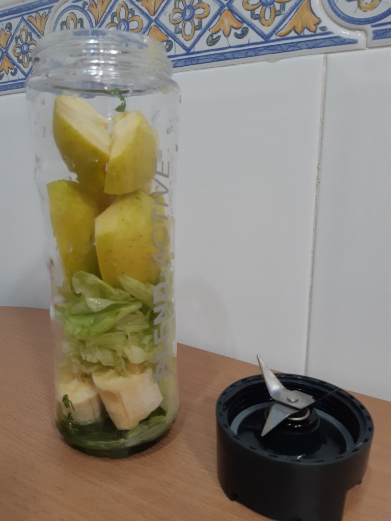 En mi caso utilizo una batidora para smoothies que tiene tapa para poder llevártelo en el mismo vaso que trituras los ingredientes, pero también se puede hacer con las tradicionales batidoras, siempre recordar añadir un poco de agua o zumo para poder facilitar el triturado y para que no quede tan sólido.
